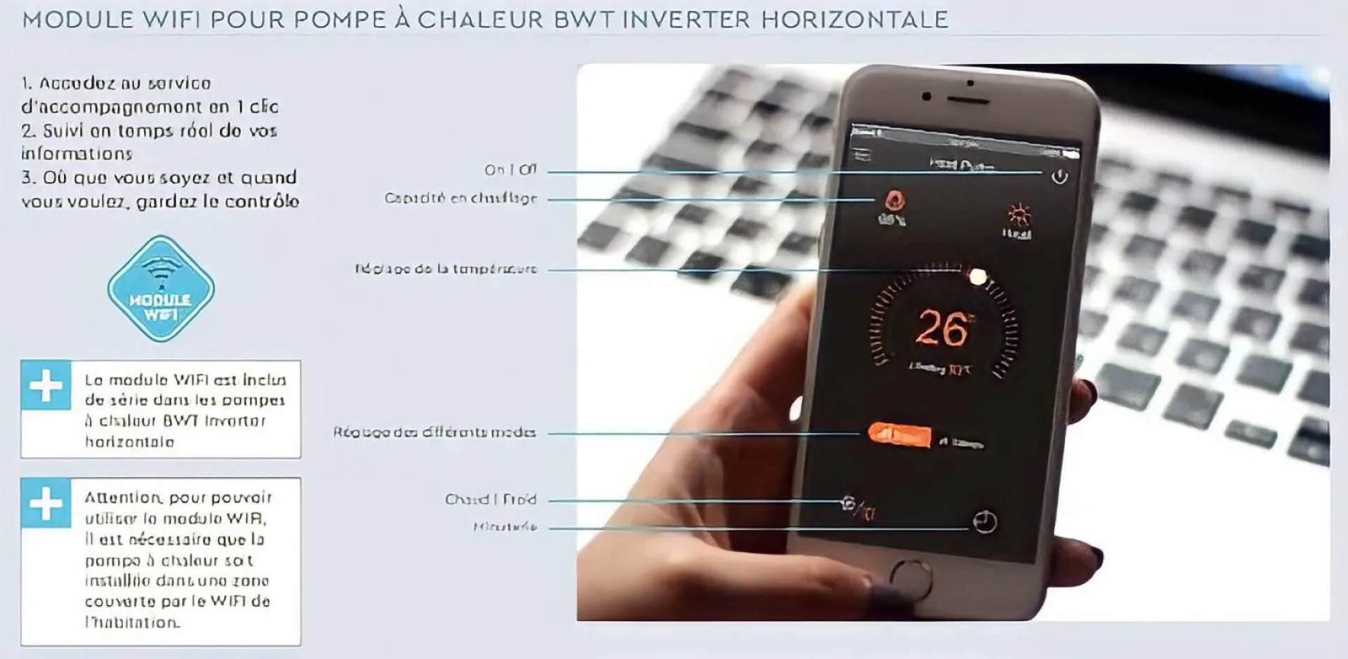 Notre gamme de pompe à chaleur est essentiellement en "INVERTER" plutôt qu'une pompe à chaleur classique "ON/OFF". En effet cette dernière fonctionne à vitesse constante c'est-à-dire à 100%, contrairement à une pompe à chaleur "INVERTER" qui varie de 20 à 100% de sa puissance suivant les besoins, ce qui lui permet d'être plus économique, très silencieuse et de plus nos pompes à chaleur sont garantie 3 ans chez vous.