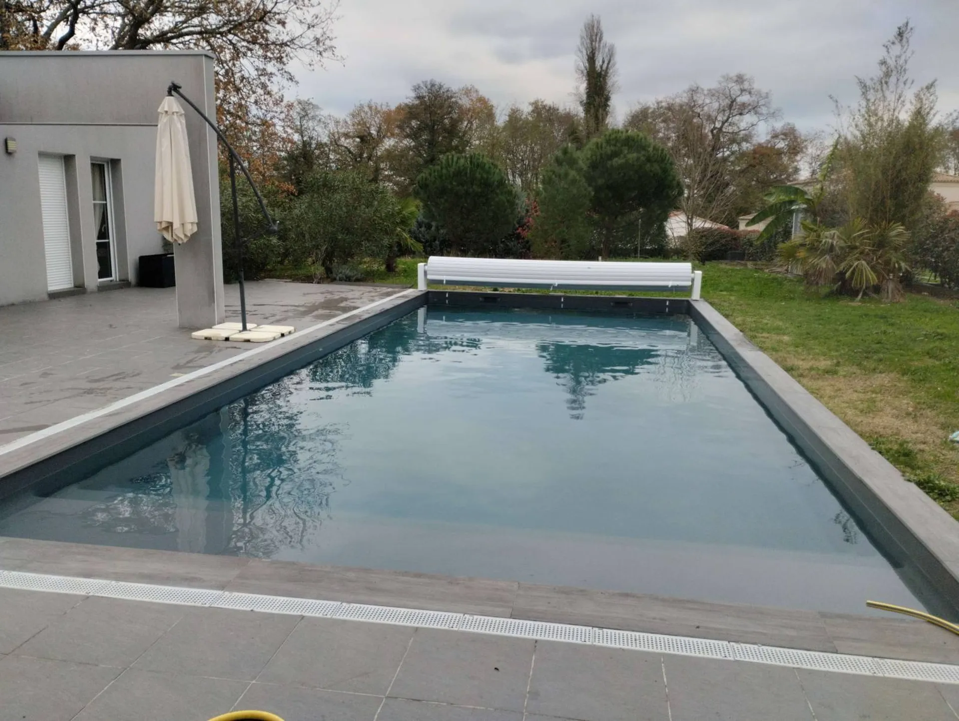 En parallèle, nous avons installé un volet roulant. Ce dispositif est idéal pour protéger la piscine des impuretés et optimiser sa sécurité. En plus de ses fonctionnalités pratiques, le volet roulant contribue à la réduction de l’évaporation de l’eau et aide à maintenir la température de l’eau plus longtemps. Son design intégré se marie parfaitement avec le nouveau liner, assurant une harmonie visuelle et fonctionnelle.