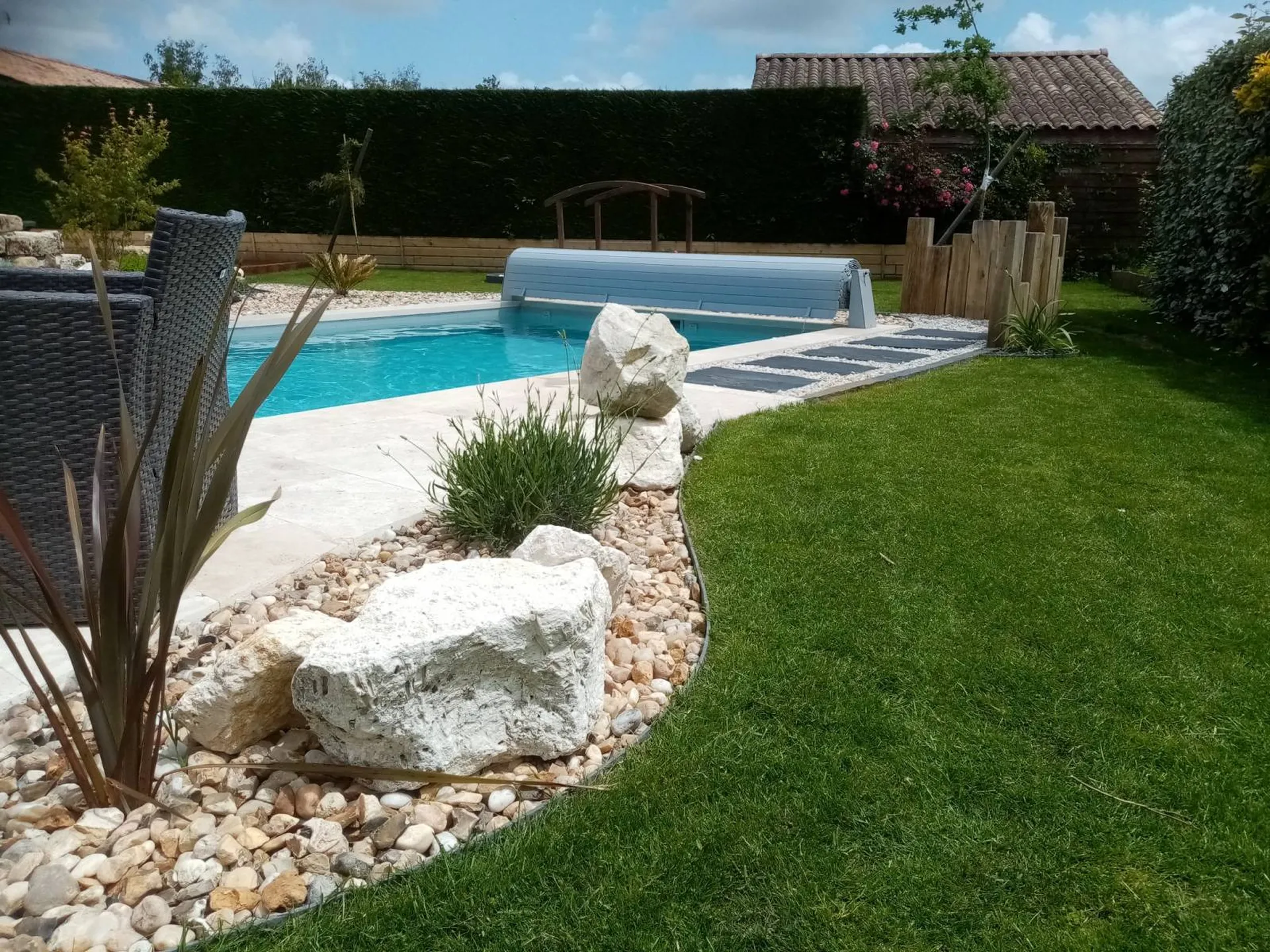Aqua 33 a choisi l'installation d'une piscine 7 x 3,5 équipée d'un escalier d'angle banquette. Cette piscine est munie de margelles en