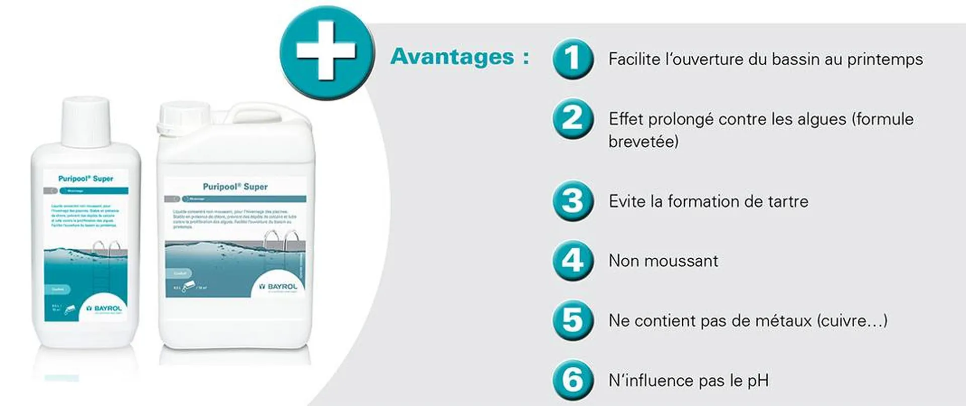 Puripool Super est un liquide concentré non moussant, pour l’hivernage des piscines extérieures.